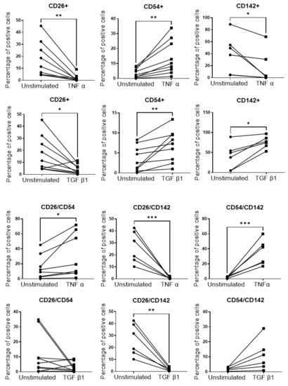 The impact of the pathological-like microenvironment on the percentages of CD26, CD54 and CD142 APC subpopulations was then addressed by flow cytometry. The gating strategy used to quantify the different APC subpopulations is shown in Supplemental Figure S3. The data showed that the abundance of APC subpopulations was differentially regulated in the fibrotic and inflamed ExAdEx models (Figure 6). The abundance of the CD26+/CD54−/CD142− subpopulation, denoted CD26+, was inhibited in both inflammatory and fibrotic-like microenvironments. It is interesting to note that TGFβ1 has been shown to promote the proliferation of CD26 cells when cells were purified from adipose tissue [2], whereas CD26 cell abundance was dramatically reduced in the TGFβ1-treated ExAdEx model. This difference observed for the TGFβ1 effects underlines the relevance of analyzing APC regulation in the fully adipose tissue microenvironment. The CD26+/CD142+ population was also inhibited in both pathological models, whereas the CD26+/CD54+ population was increased in the inflamed microenvironment but not in the fibrotic microenvironment. In contrast, the abundance of the CD54+ subpopulation increased in both conditions. The CD142+ subpopulation was reduced by inflammation but increased by fibrosis, whereas the CD54+/CD142+ population increased in the inflamed microenvironment only. A schema reporting the effects of TNFα and TGFβ1 treatments on APC subpopulations is presented in Supplemental Figure S4. Recently, Raajendiran et al. reported APC subpopulations giving rise to adipocytes with divergent metabolic capacities [33]. The impact on the proliferative and adipogenic capacities of the CD54 and CD142 subpopulations, as well as on the metabolic and endocrine capacities of their adipocyte progenies, remains to be investigated. However, knowing the potential of APCs to undergo differentiation into myofibroblasts when exposed to an inflammatory or fibrotic environment, it is tempting to speculate that the CD54 subpopulation will display a profibrogenic/proinflammatory phenotype in the pathological model. The accumulation of CD54+ APCs in the subcutaneous adipose tissue of high-fat-diet-induced obese mice without a corresponding increase in mature adipocyte differentiation supports this hypothesis [34]. CD142, also named tissue factor, plays a critical role in the activation of the coagulation cascade that facilitates blood clot formation. Its overexpression has been reported in obese adipose tissue, and its role has been suggested in developing inflammatory obesity (for review see [35]). The role of CD142 APCs in adipogenesis is more controversial because this subpopulation is described as fully adipogenic or as an inhibitor of adipogenic differentiation via paracrine effects [36].