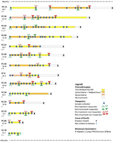 Figure 1. Patients and their respective treatments. Depiction of the metastatic profile, treatment protocols, and sample collections from patients analyzed in our study. PDAC patient (PC) number, age, gender (M,F), and metastatic location(s) are provided.