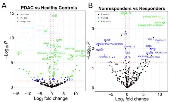 Figure 2. Proteins differentially expressed in EVs. (A) Volcano plot representing the identified proteins in MS (comparison between patients (PDAC) and healthy control samples). (B) Volcano plot representing the identified proteins in mass spectrometry (comparison between patients that are nonresponders and responders to chemotherapy). The green points represent proteins significantly regulated after correction for multiple testing. The blue points represent proteins significantly regulated without correction for multiple testing. The black points represent proteins with insignificant regulation.