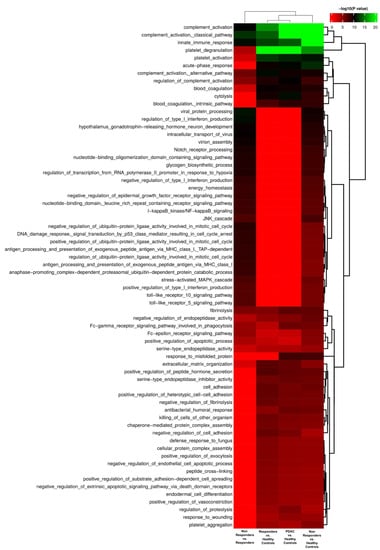 Protein expression analysis revealed that 102 distinct proteins exhibited statistically significant differences between PDAC patients and healthy controls, 59 of which were upregulated in PDAC patients. Of these, we identified the presence of multiple IgG fragments (Figure 2A, Supplementary Table S3). In fact, the functional analysis of proteins significantly upregulated or downregulated in EVs from PDAC patients (responders and nonresponders) and as compared to healthy controls, revealed enrichment in proteins associated with humoral immune response and complement activation, among others (Figure 3).