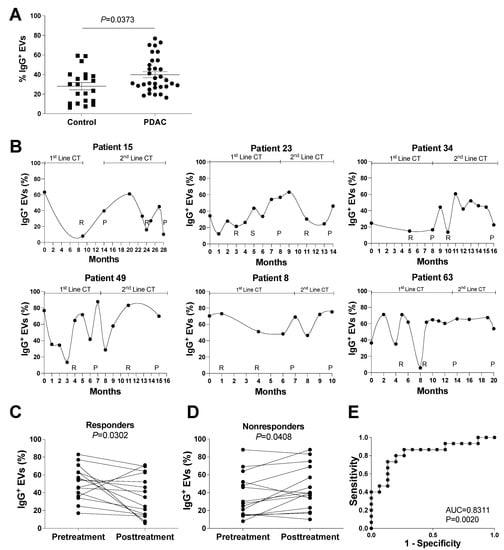 Figure 4. IgG+ EVs in healthy controls and PDAC patients. Vesicle flow cytometry data of plasma samples from PDAC patients and healthy controls, as indicated. (A) Comparison of IgG+ EVs between PDAC patients and healthy controls, p = 0.0373, by Wilcoxon test. (B) Longitudinal evaluation of plasma IgG+ EVs in patients followed during at least 2 lines of chemotherapy (mFOLFIRINOX in the 1st line, and Gemcitabine with Nabpaclitaxel in the 2nd line, as indicated), that express CA19.9 (patients 15, 23, 34, and 49); or do not express CA19.9 (patients 8 and 63). The moments of imagiological evaluation are indicated (R for response, S for stabilization, and P for progression to chemotherapy). (C,D) Evolution of IgG+ EVs before and after treatment with chemotherapy in 15 situations of response (patients 15, 23, 34, 49, 63, 69, 70, 73, and 94) (C) and no response to treatment (patients 8, 10, 15, 21, 22, 23, 34, 49, 66, and 73) (D). p = 0.0302 (C) and p = 0.0408 (D), by t-test. (E) ROC curve for the IgG+ EV to discriminate response in patients with metastatic PDAC.