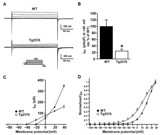 Delayed rectifier K+ currents in Tg2576 primary hippocampal pyramidal neurons. (A) Representative traces of IDR recorded in the WT (top) and Tg2576 (bottom) primary hippocampal pyramidal neurons at 12 DIV using the voltage protocol shown in the lower part of the panel. (B) Quantification of IDR densities represented in panel A. The peak value IDR was measured at the end of the +40 mV depolarizing pulse. Values are expressed as mean ± SEM of 3 independent experimental sessions. * p < 0.001 vs. WT. (C) Current-voltage (I/V) relationships for the IDR recorded in the WT and Tg2576 hippocampal neurons. Values are expressed as mean ± SEM of 3 independent experimental sessions. (D) Steady-state activation properties of IDR recorded in WT and Tg2576 primary hippocampal neurons. Values are expressed as mean ± SEM of 3 independent experimental sessions. * p < 0.001 vs. WT.