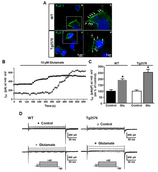 Finally, considered the non-conducting and structural functions of KV2.1, further implications unrelated to neuronal excitability could arise from its overexpression in AD. Indeed, immediately facing astrocytic processes and lying on neuronal cell membranes over the ER subsurface cisternae [73], the KV2.1 clusters play a key role in inducing ER-PM junctions and provide specialized molecular platforms to regulate both somatodendritic Ca2+ signaling and ion channel trafficking. In particular, it has recently been shown that KV2.1 clustering at neuronal ER-PM junctions promotes the clustering of PM L-type Ca2+ channels and their coupling to ryanodine receptor ER Ca2+ release channels [74], hence allowing the generation of localized Ca2+ release events. Moreover, the fact that KV2.1 clusters induce the formation of -and localize at- ER-PM junctions confers to KV2.1 the ability not only to trigger a structural remodeling of the ER but also to affect neuronal Ca2+ handling by modulating ER Ca2+ uptake [75]. Of note, we have recently reported about the occurrence of an ER Ca2+ remodeling in the Tg2576 primary neurons. In particular, we showed that the enhanced activity of the Na+/Ca2+ exchanger 3 promotes an increased ER Ca2+ refilling in Tg2576 neurons in comparison with WT neurons [47]. Moreover, we demonstrated that the IA-mediating KV3.4 channel subunit, which is overexpressed and functionally upregulated in Tg2576 reactive astrocytes, regulates astrocytic [Ca2+]i transients and ER Ca2+ levels [52,76]. The findings reported in the present study bring further information about the ionic dysregulation occurring in the Tg2576 mouse brain, hence suggesting new pathways to explore in studying the alterations of Ca2+ signaling and homeostasis in AD and the involvement of potassium channels in these processes.
