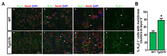 To investigate whether KV2.1 clustering was increased in the Tg2576 model also in vivo, we performed confocal double immunofluorescence analyses on the somatosensory cortex of both 3-month-old WT and Tg2576 mice, where the KV2.1 protein expression and function have been extensively characterized [23,56]. Interestingly, the confocal double immunofluorescence analysis revealed that the anti-KV2.1 antibody depicted a clear and pronounced clustered PM labeling of NeuN-positive neurons in layer V of the somatosensory cortex of both 3-month-old WT and Tg2576 mice (Figure 6A). More important, quantitative analyses showed a significantly higher number of cortical neurons displaying KV2.1 clustering in the layer V of the Tg2576 mice in comparison with the WT littermates (Figure 6B).