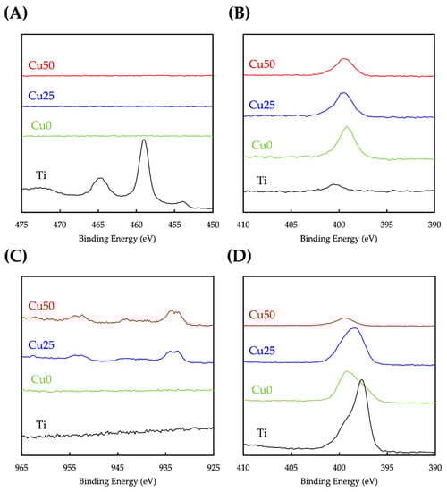 XPS spectra of (A) Ti, (B) N, (C) Cu, (D) O of the 3D-printed Ti6Al4V scaffolds before and after PDA/Cu coating.