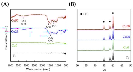 The surface modifications of Ti with PDA and Cu were confirmed using XPS analysis and as shown in Figure 3. As seen from the results, the high-resolution spectra of Ti and O confirmed that the entire surface of the scaffolds were coated with PDA and/or Cu due to the absence of Ti spectra from Cu0, Cu25 and Cu50. Figure 3B shows that PDA coating was successful as seen from the presence of N spectra. The reduction in N spectra, coupled with the presence of Cu spectra in both Cu25 and Cu50, confirmed the successful loading of varying concentrations of Cu onto the scaffolds []. Taken together, it could be seen that the surfaces of Ti scaffold could be easily modified using the one-step immersion process. The existence and comparison of the different functional groups between Cu0, Cu25 and Cu50 were analyzed using FTIR and are shown in Figure 4A. Cu was noted to be functionalized and attached to PDA via the following bonds: -OH, N–H at 3250 cm−1, C=O at 1640 cm−1, C=N, C=C at 1600 cm−1 and C–O at 1400 cm−1 []. The increase in peak intensity of the above bonds is due to increase in Cu and PDA functionalization. The crystalline structures of the scaffolds were detected using XRD and as shown in Figure 4B. There were multiple Ti inherent characteristic peaks at the 2θ values of 35, 38.5 and 40. The above results further confirmed that PDA and Cu were successfully modified onto Ti via covalent bonds and that the modification did not affect the presence of Ti []. Furthermore, it was possible to modify the surfaces of Ti with varying concentrations of substrates, thus allowing us to fabricate scaffolds with individualized functions.