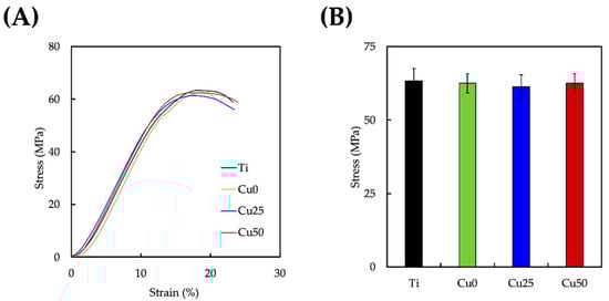 The strain–stress curves showed that the TiPCu scaffolds were first elastically stretched, followed by deformation, and ultimately leading to fracture of the scaffold []. As noticed in Figure 6, beginning from the point of compressive strength, the stress on the scaffold is almost at its elastic stage and is stepped up linearly with distance since the scaffold deformation does not change, while the pressure exerted by the probe of the device is transmitted directly to the specimen platform through the scaffold. The TiPCu scaffold had the greatest breaking point averaging of 63.4 ± 4.2 MPa and compressive modulus of 472.2 ± 12.5 MPa in the strain range of 0.5–11.5%, without significant differences in all testing groups. Due to the increased toughness of Ti itself, it produces a large deformation to resist external force when subjected to axial pressure, while the coating procedure did not seem to affect the overall mechanical properties of the scaffold.