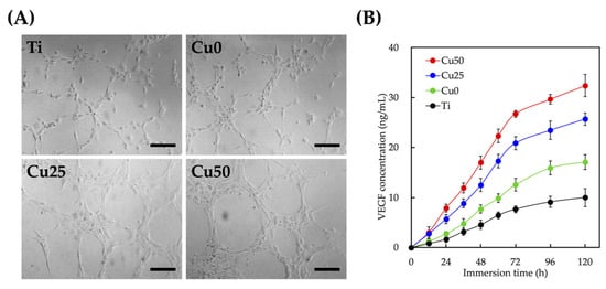 The effect of Cu/PDA coating on the angiogenesis of HUVECs was studied by the tube formation analysis. Tube formation is a traditional method for considering endothelial cells differentiation behaviors in vitro. As for the tube formation assay, the HUVEC treated with Cu25 and Cu50 advancingly assembled more tubes compared with Ti and Cu0 (Figure 8A). In our previous study, Cu ion was shown to be pro-angiogenic via upregulating VEGF production []. Therefore, the secretion of VEGF was evaluated as shown in Figure 8B. The time-dependent secretion kinetics demonstrated that all the scaffolds demonstrated similar secretion trends, with rapid secretion for the first 48 h with equilibrium at 72 h. However, the various scaffolds differ in their final VEGF secretion rate, with Ti, Cu0, Cu25 and Cu50 reaching a final secretion capacities of approximately 8%, 15%, 30% and 42%, respectively. Previous studies indicated that VEGF play an important factor in the development and formation of the angiogenic process []. The stimulatory effect of Cu on angiogenesis is due to the upregulation of VEGF expression and the KDR activation after those cells treated with Cu-contained extracts []. Therefore, the above results indicated that our scaffolds were able to induce VEGF secretion in a stable manner, thus also indicating that Cu-modified Ti scaffolds have the capability to enhance angiogenesis in a dose-dependent manner. Cu/PDA-coated Ti scaffolds used in this study were demonstrated helpful for the first time for tube formation of HUVEC.