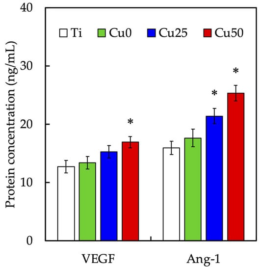The levels of VEGF and Ang-1 secreted from WJMSCs were evaluated using an ELISA kit and shown in Figure 9. After 3 days of culture, it could be seen that Cu50 had significantly higher levels of both VEGF and Ang-1 secretion as compared to Ti. There was approximately an increase of 33.0% VEGF and 59.2% Ang-1 from the Cu50 scaffolds. On the other hand, there was no significant difference between VEGF secretion of Cu25 and Ti. However, Cu25 was noted to have a 1.34-fold increase of Ang-1 as compared to Ti. Various kinds of angiogenic-related biomarkers are required at different stages for blood vessel development. Initially, the recruitment, proliferation and differentiation of the endothelial cells require high concentrations of VEGF for tube formation []. Subsequently, the maturation and stabilization of blood vessels require other growth factors, such as Ang-1, to weaken after the cell proliferated. VEGF is a family of growth factors that work via tyrosine kinase receptors on endothelial cells and are reported to be induced during hypoxic conditions. Of all the VEGF, VEGF-A is the most studied and is known to bring about migration of endothelial cells, create fenestration and subsequent creation of vascular lumen. Sen et al., indicated that Cu utilized similar pathways used by hypoxia to induce VEGF secretions []. It was shown that Cu concentrations as low as 0.005 mM was sufficient to induce angiogenesis []. In the present study, the effective concentrations of Cu ions in Cu25 ranged from 0.05 mM to 0.33 mM and in Cu50 ranged from 0.09 mM to 0.52 mM. The toxicity levels of Cu on MSCs were reported be around the range of 0.25 mM; however, our studies reported on cumulative Cu concentrations over a period of 14 days, which were shown to have no cytotoxicity on cells and yet were able to promote vascular tube formation [].