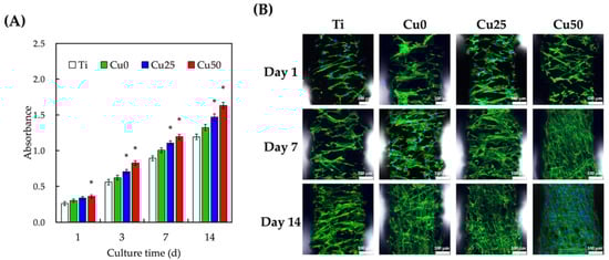 (A) Cell proliferation and (B) F-actin (green) and DAPI (blue) staining of WJMSCs on the TiPCu 3D scaffolds at various time points. * indicates a significant difference (p < 0.05) from the Ti group. Data are presented as mean ± SEM, n = 6 for each group. The scale bar is 100 µm.