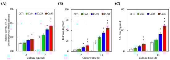 Osteogenic-related differentiation marker of (A) ALP, (B) BSP and (C) OC expression of WJMSCs cultured on different TiPCu scaffolds at 7 and 14 days. * indicates a significant difference (p < 0.05) from the Cu0 group. # indicates a significant difference (p < 0.05) from the Cu25 group. Data are presented as mean ± SEM, n = 6 for each group.