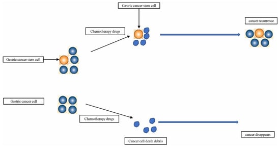 Many researchers find that cancer stem cells may be a key factor in the treatment of advanced cancer. For instance, T Lapidot et al. found that a large number of cell colonies that they called leukemia-initiating cells could be generated by transplanting a small number of CD34+CD38- leukemia cells into mice [10]. T Reya et al. believed that CSCs are the key to cancer treatment. If the CSCs are not killed, but only ordinary cancer cells are killed, the cancer will soon relapse [11]. American Association for Cancer Research (AACR) in 2006 defined that CSCs in tumors have the ability to self-renew and generate heterogeneous tumor cells. Experts at the meeting believed that this cell subset may be resistant to classical treatments, and new drugs need to be developed to selectively target cancer stem cells to treat cancer [12]. With the gradual deepening of research on CSCs, it has been discovered that CSCs are the initiating cells of malignant tumors. They play a key role in cancer metastasis, recurrence, and chemotherapy resistance [13,14,15,16]. In view of the important role of CSCs in GC, many scholars believe that the key to the treatment of GC is to completely eliminate CSCs in gastric cancer [17,18,19] (Figure 1). In order to improve the prognosis of patients with advanced GC, finding new drugs to target GCSCs may be the direction of therapy [20,21]. Genes can regulate the stemness of GC cells, and some drugs target the stemness of GC cells by changing the expression of these gastric, cancer, stem cell-related genes [22,23,24,25,26]. Therefore, in this review, we focused on related genes in GCSCs and drugs and provide some information to treat GC by targeting its stemness.