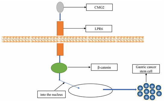 Many genes can regulate the stemness of GC cells by affecting WNT, NOTCH, Hedgehog, and HIPPO signaling pathways (Table 1). The WNT signaling pathway is a very important pathway in GCSCs. Based on Kaiyun Guo et al., tumor necrosis factor-α-inducible protein (Tipα) promotes the tumor stem cell-like properties of GC cells by activating the Wnt/β-catenin signaling pathway, thereby accelerating the progression of GC, and targeting Tipα may be the strategy to treat GC [55]. According to Chengdong Ji et al., capillary morphogenesis gene 2 (CMG2) is highly expressed in GC, and CMG2 interacts with LRP6 in GCSCs to activate the Wnt/β-catenin pathway. Their results revealed that CMG2 promotes GC by maintaining GCSCs progression and may serve as a new prognostic marker and target for human GC therapy [56] (Figure 2). Yunhe Gao et al. found that the expression of ring finger protein 43 (RNF43) was decreased in GCSCs. RNF43 could inhibit the stemness of GC cells by inhibiting the Wnt/β-catenin pathway, the specific mechanism is that RNF43 upregulates the expression of Lgr5 protein, an upstream activator of WNT signaling pathway [57].