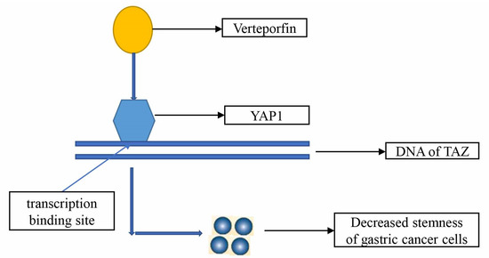 - Giraud, J.; Molina-Castro, S.; Seeneevassen, L.; Sifré, E.; Izotte, J.; Tiffon, C.; Staedel, C.; Boeuf, H.; Fernandez, S.; Barthelemy, P.; et al. Verteporfin targeting YAP1/TAZ-TEAD transcriptional activity inhibits the tumorigenic properties of gastric cancer stem cells. Int. J. Cancer 2020, 146, 2255–2267. [Google Scholar] [CrossRef] [PubMed]