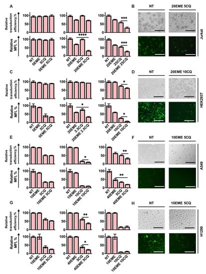 The quantitative differences in antiviral action between Emetine and Chloroquine and its combinations. Jurkat and HEK293T cell lines were pre-treated with EME in combination with CQ and 24 h after that were infected with RD HIV-1. (A,C,E,G) Graphs represent the relative percentage of transduced cells and relative MFI level in cells pre-treated with EME and CQ compared to non-treated cells. (B,D,F,H) Phase-contrast and fluorescence images of cells treated with EME and CQ compared to non-treated cells. Scale bars 200 μm. Asterisks: * p < 0.05; ** p < 0.01; *** p < 0.001; **** p < 0.0001.