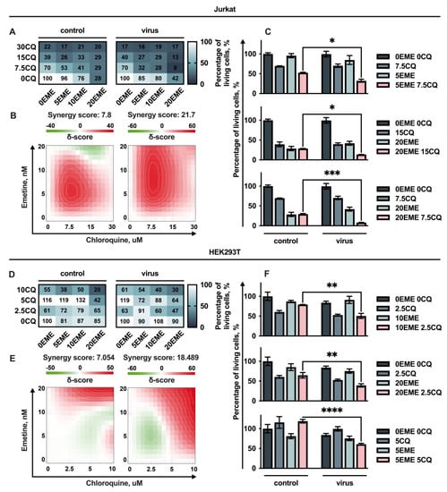Analysis of the effect of Emetine in combination with Chloroquine. Jurkat and HEK293T cell lines were co-pre-treated with EME in combination with CQ and infected 24 h after. Viability was measured 72 h post drug treatment using Trypan blue exclusion; (A,D) dose–response matrix represents the percentage of viable cells compared to non-treated control cells in both control (not-infected) and virus (infected) groups. (B,E) Synergy plots represent the effect of the drug combination that was calculated and visualized using SynergyFinder v2.0 software and a ZIP reference model. Red regions indicate synergism, white—additive effect, green—antagonism; (C,F) the graphs represent the viability of cells in % of control for effective combinations. Asterisks: * p < 0.05; ** p < 0.01; *** p < 0.001; **** p < 0.0001.