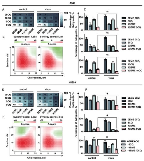 Analysis of the effect of Emetine in combination with Chloroquine. A549 and H1299 cell lines were co-pre-treated with EME in combination with CQ and infected 24 h after. Viability was measured 72 h post drug treatment; (A,D) dose–response matrix represents the percentage of viable cells compared to non-treated cells in both control (not- infected) and virus (infected) groups. (B,E) Synergy plots represent the effect of the drug combination (synergism/additive effect/antagonism) that was calculated and visualized using SynergyFinder v2.0 software and a ZIP reference model. Red regions indicate synergism, white—additive effect, green—antagonism; (C,F) the graphs represent the viability of cells in % of control for effective combinations. Asterisks: ns p > 0.05; * p < 0.05.