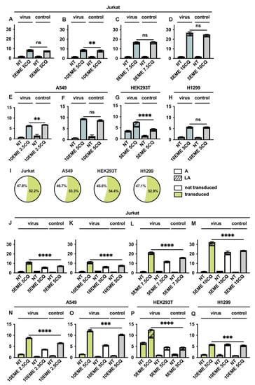 Emetine and Chloroquine induce apoptosis of infected cells. Jurkat, A549, HEK293T, and H1299 cell lines were co-pre-treated with EME in combination with CQ and infected with RD HIV-1 24 h after. (A–H) The graphs represent a distribution of Annexin V/PI-stained cells 72 h post infection compared to control cells. (I) Pie charts represent the percentage of transduced and non-transduced cells 72 h after infection. (J–Q) The graphs represent a distribution of Annexin V/PI-stained cells 72 h post-infection in transduced and non-transduced cells compared to control cells. A—early apoptosis (Annexin V single-positive cells), LA—late apoptosis (Annexin V/PI double-positive cells). Asterisks: ns p > 0.05; ** p < 0.01; *** p < 0.001; **** p < 0.0001.