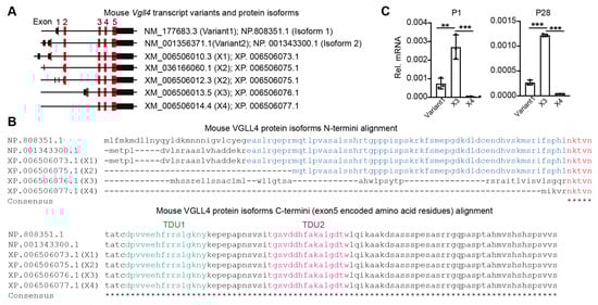 In mice, the Vgll4 gene has seven annotated transcript variants (NCBI) that encode five VGLL4 protein isoforms (Figure 1A, Supplementary Table S1). Among the VGLL4 protein isoforms, their N-termini are diversely encoded by one or two exons, and their C-termini are identically encoded by three common exons (Figure 1B). Since TDUs are encoded in the last exon (exon 5), all the Vgll4 variant products have TDU domains (Figure 1B). Based on whether containing exon 2, we categorized the Vgll4 transcript variants into two groups: (I) Vgll4 variants containing exon 2 (variant 1 and 2; X1 and X2) and (II) Vgll4 variants without exon 2 (X3 and X4).
