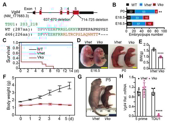 VGLL4 deletion resulted in perinatal lethality: (A) Vgll4 gene structure showing Vgll4-mutant allele. Green and red letters indicate wild-type and d46 mutant amino acid sequences, respectively; * indicates a premature stop codon; (B) distribution of genotypes at E16.5, E18.5, and P0. Embryo/pup numbers for each genotype are displayed in the bar graph. **, Mendelian ratio chi-squared test, p < 0.01; (C) survival curve of Vgll4 d46/+ (Vhet) and Vgll4 d46/d46 (Vko) pups. Postnatal day 0 (P0) was designated as the date of delivery. For each group, N = 12; (D) gross morphology of embryos and mouse pups at indicated ages. Scale bar: 5 mm; (E) body weight at E18.5; (F) mouse pups’ body weight gain in the first 5 days after delivery. N = 3; (G) gross morphology of mouse pups at P5; (H) cardiac Vgll4 mRNA expression. E13.5 hearts were collected for mRNA isolation and qRT-PCR measurement. TDU1 domain of Vgll4 was not detectable in the Vgll4 mutant transcripts. (E,H), Student’s t-test: **** p < 0.0001. N = 5–6.