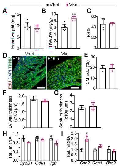 As the YAP/TEAD1 complex is essential for fetal CM proliferation [], and VGLL4 is a suppressor of this complex [], we investigated whether the inactivation of VGLL4 increases fetal CM proliferation. 5-ethynyl-2′-deoxyuridine (EdU), an analogue of thymidine, was used to label proliferating CMs at E16.5. As shown in Figure 3D,E, the CM EdU incorporation rate was not distinguishable between Vhet and Vko. Additionally, compared with Vhet, Vko had a similar left ventricle free wall and septum thickness (Figure 3F,G). In line with these observations, the expression of several cell proliferation genes, including CyclinB1 (CycB1), Cdk1, and Igf1r, was not altered in the Vko hearts (Figure 3H). We further examined three well-known YAP/TEAD target genes: cellular communication network factor 2 (Ccn2, also known as Ctgf) [], cellular communication network factor 1 (Ccn1, also known as Cyr61) [], and baculoviral IAP repeat containing 2 (Birc2, an apoptosis inhibitor gene) []. Although Ccn2 was upregulated in the Vko heart, Ccn1 and Birc2 showed no difference between Vhet and Vko (Figure 3I), suggesting that Vgll4 partially suppresses the YAP/TEAD complex in the fetal heart.