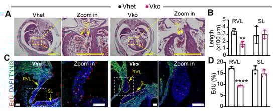 We further measured the tricuspid valve interstitial cell (VIC) proliferation rate by labeling the fetal heart with EdU for two hours. Compared with Vhet, the Vko embryos had a significantly lower EdU incorporation rate in the RV leaflets. Although the Vko septal leaflets also had lower EdU incorporation rates, the difference did not reach significance (Figure 4C,D).