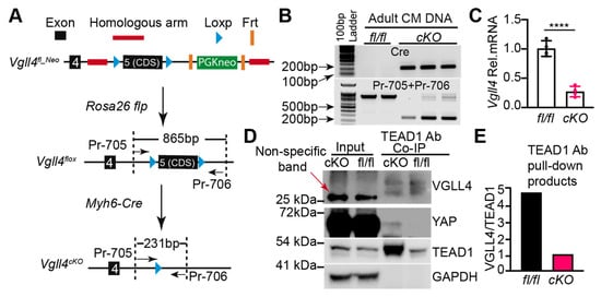 Generation and validation of a Vgll4 flox allele: (A)cardiac-specific Vgll4 depletion strategy. The coding sequence of exon 5 (exon 5 CDS) was flanked by LoxP sites. A PGKneo selection cassette flanked by Frt sites was used for selection of recombinants. F1 Vgll4flox_Neo mice were bred to Rosa26 flp mice to remove the PGKneo cassette. Crossing Vgll4 flox allele with Myh6-Cre depleted exon 5 CDS in the CMs; (B) PCR validation of Vgll4 exon 5 CDS excision; (C) qRT-PCR measurement of Vgll4 mRNA. Student’s t-test, **** p < 0.0001, N = 4; (B,C) adult hearts were dissociated to yield purified CMs for DNA (B) and RNA (C) isolation; (D) co-immunoprecipitation (Co-IP) assay. Mouse origin TEAD1 antibody (BD, 610923) was used to pull down VGLL4 from heart lysate, and Rabbit origin TEAD1 antibody (CST, 12292S) was used in immunoblot to detect TEAD1. Red arrow indicates a non-specific band. GAPDH was used as loading control; (E) VGLL4 and TEAD1 protein ratio, determined by quantification of (D). Precipitated VGLL4 proteins were normalized to TEAD1.