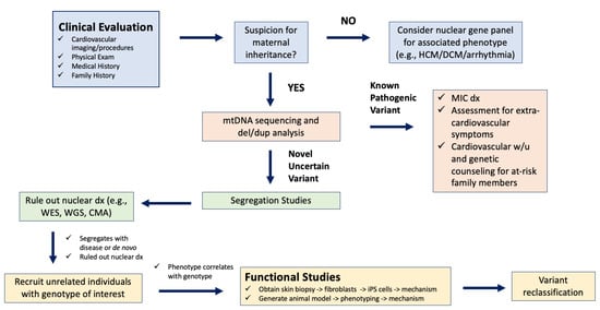 Research flow chart for novel mtDNA variant discovery. CMA, chromosomal microarray; del/dup, deletion/duplation; dx, diagnosis; DCM, dilated cardiomyopathy; HCM, hypertrophic cardiomyopathy; iPS cells, induced pluripotent stem cells; WES, whole exome sequencing; WGS, whole genome sequencing; w/u, work-up.