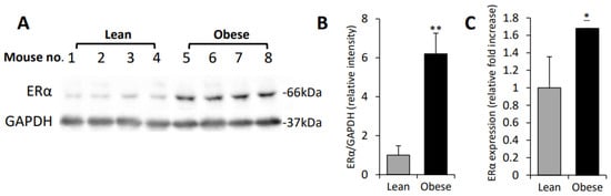 In agreement with earlier reports [30,34,59,65], following 12 weeks on HFD, the experimental mice became obese, as evidenced by a 38% increase in their body weight, compared to control diet-fed lean mice (p < 0.001). E0771 cells were then implanted orthotopically in obese and lean mice, as described in Methods, and tumor growth was monitored for 14 days. Consistent with previous findings [30,34,59,65], growth of E0771 tumors was augmented in obese, as compared to lean, mice (on day 14 tumors from obese mice were 2.4-fold larger than tumors from lean mice, p < 0.004). As expected, the extent of Mϕ infiltration, the hallmark of obesity-accelerated breast tumor growth [33,34], was increased 1.9-fold (p < 0.03) in tumors grown in obese versus lean mice (Supplementary Figure S1A,B). Additionally, the obese state attenuated the sensitivity of E0771 tumors to radiotherapy—backbone treatment modality in ER + BC (Supplementary Figure S1C). Given the role of ERα in growth and radio-resistance of BC [5,6,7,8], we examined ERα expression levels in tumors derived from obese versus lean mice. Immunoblot and qPCR analysis of the tumor tissue revealed that expression of the full length 66-kDa ERα protein and mRNA was significantly increased in E0771 tumors growing in obese, as compared to lean, mice (Figure 1A–C). Of note, there was no difference in the levels of 46-kDa ER isoform (known to antagonize the full-length ER−mediated responses in BC [67,68]) between tumors growing in obese versus lean mice.