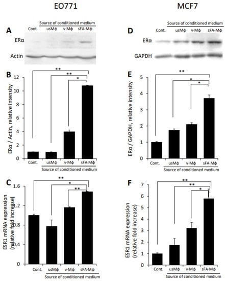 Emerging evidence indicates that tumor-infiltrating immunocytes (including Mϕ) are capable of inducing ERα expression in hormone-responsive tumor types [43,69] via cytokine-mediated mechanism. Based on these observations, along with the notion that Mϕ represent the principal pro-cancerous immunocyte population implicated in obesity-accelerated BC tumorigenesis [35,42], and the well-documented increase in Mϕ infiltration in E0771 tumors under obese conditions (References [30,33,34] and Supplementary Figure S1B), we sought to investigate whether Mϕ are capable of modulating ER expression in the setting of obesity-associated BC. To mimic conditions occurring in breast tumor-bearing obese patients/experimental animals (i.e., adverse activation of Mϕ [35,41] due to the presence of increased concentrations of sFA in circulation [36]), murine and human (i.e., E0771, MCF7) ER + BC cell lines were incubated with medium conditioned by primary Mϕ (isolated as described in Methods), either unstimulated or stimulated by SFA (i.e., palmitate, dominant SFA present in fat depots/circulation of female patients [70] and responsible for adverse Mϕ activation under obese conditions [35,37,39,71]. As shown in Figure 2, SFA-stimulated Mϕ-conditioned medium markedly upregulated ERα protein (Figure 2A,B,D,E), as well as mRNA expression (Figure 2C,F) of ESR1 gene, encoding for ERα, in E0771 and MCF7 cells. The effect of SFA-stimulated Mϕ on ER expression was evident even in the 4T1 murine BC cell line (Supplementary Figure S2A), which is often considered ER−negative, but in fact expresses extremely low levels of ERα [72]. Similar effects were observed in MCF7 cells incubated with a medium conditioned by SFA-stimulated human Mϕ differentiated from promonocytic cell line THP-1 [73] (Supplementary Figure S2B).