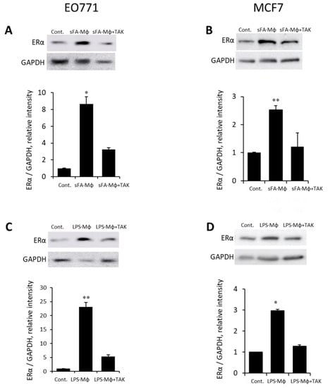 Since Mϕ activation by SFA under the obese state involves a TLR4-dependent mechanism [35,37,39,71], we next tested the effect of TLR4 inhibition on the ability of SFA-stimulated Mϕ to induce ER expression. As shown in Figure 3A,B, specific TLR4 inhibitor TAK-242 abolished the ability of SFA-stimulated Mϕ to induce ERα expression in E0771 (A) and MCF7 (B) cells, in agreement with TLR4-activating properties of SFA [37,38,39].