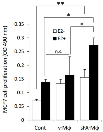To verify the functional significance of ERα upregulation, depicted in Figure 2, we next assessed the effect of medium conditioned by SFA-stimulated Mϕ on the proliferative response of MCF7 cells to estrogen. For this purpose, cells were first depleted of estrogen for 2 weeks (as detailed in Methods) and then treated with 17β estradiol in the presence or absence of medium conditioned by either unstimulated or SFA-stimulated Mϕ (Figure 4). As expected, 17β estradiol increased proliferation of MCF7 under all conditions. However, the presence of medium conditioned by SFA-stimulated Mϕ (but not vehicle-stimulated Mϕ) significantly augmented proliferative response to estradiol (Figure 4), consistent with the upregulation of ERα levels (Figure 2). Importantly, stimulated Mϕ also enhanced MCF7 proliferation under conditions of estrogen depletion (i.e., without addition of exogenous estrogen—Figure 4, white bars). In vitro estrogen depletion procedure ensures that only extremely low residual estrogen levels are present in the medium. In addition, this procedure mimics depletion of estrogen that occurs in BC patients treated with aromatase inhibitors. In this context, it is worthy to note that enhanced MCF7 proliferation, triggered by stimulated (as compared to unstimulated) Mϕ, was observed even in the presence of residual levels of estrogen (Figure 4). These data suggest that in the setting of obesity, upregulation of ER levels in BC cells by SFA stimulated Mϕ may enable their proliferative response even to extremely low levels of estrogen, thus providing a molecular/cellular explanation for the observation that obese patients are more likely to experience ER+BC recurrence after treatment with aromatase inhibitors [23] and generally contributing to the worse response to hormonal therapy in BC [13,19,79]. Collectively, these results confirmed the ability of obese milieu component-activated Mϕ to increase the sensitivity of BC cells to estrogen through upregulation of ERα.