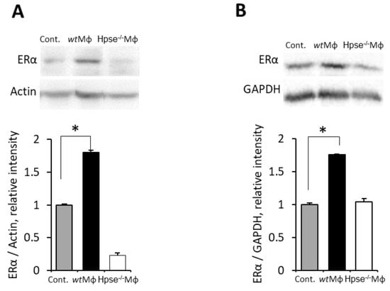 Heparanase-deficient macrophages stimulated by SFA failed to upregulate ERα levels in BC cells. E0771 (A) and T47D (B) cells either remained untreated (Cont.) or were incubated (24 h, 37 °C) with medium conditioned by macrophages derived from either wild-type (wtMϕ) or heparanase-knockout (Hpse-/- Mϕ) mice, and stimulated by saturated fatty acid, either palmitic (A) or stearic (B), as described in Methods. ERα protein levels were determined by immunoblotting (top) and quantified using ImageJ software (bottom). Error bars represent ± SD. * p < 0.002.