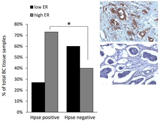 Sections of human ER + BC tissue samples (n = 58) were processed for immunohistochemistry with anti-ERα and anti-heparanase (Hpse) antibodies, as described in Methods. Inset: representative images of heparanase-positive (top) and heparanase-negative (bottom) breast tumor tissue specimens (invasive ductal carcinoma), original magnification ×200. To define tumor as Hpse-positive, a cutoff point of 25% immuno-stained tumor cells was used, as in Ref. [53]. The intensity of ERα staining was scored as weak (1), moderate (2), or strong (3), as described in Methods; tumors with staining score 1 were categorized as “low ER” (black bars); tumors with staining score 2 and 3 as “high ER” (grey bars). Chi-squared analysis was then used to assess the relationship between heparanase positivity and high versus low ER levels. Significant correlation between expression of heparanase and high ER levels was noted:an almost 2-fold higher proportion of high ER expression was detected in heparanase-positive versus heparanase-negative tumors (73% vs. 40%, chi-square test * p = 0.0135).