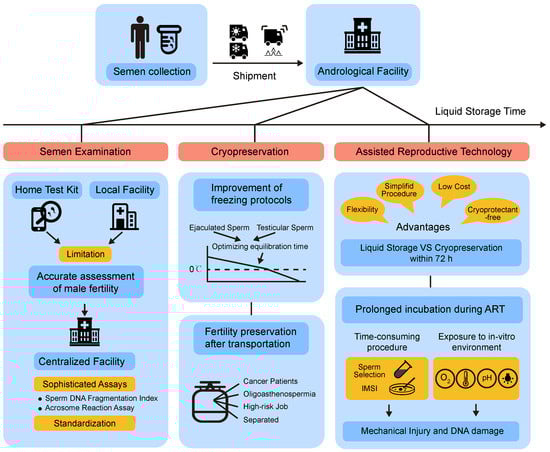 Liquid storage of human sperm provides flexibility not only for ART, but also for semen cryopreservation. In recent years, the demand for fertility preservation in men for future ART, oncologic care, and personal reasons has increased dramatically [] (Figure 1). Cancer patients are highly advised to preserve their sperm before accepting chemotherapy or radiotherapy, which can render them permanently infertile []. In addition, for men engaging in high-risk jobs or even the normal male population, “fertility insurance” is also in demand. To date, cryopreservation is the only method for long-term storage of human spermatozoa. However, semen needs to be frozen immediately after ejaculation to prevent deterioration. Meanwhile, the freezing process requires specialized ultra-low-temperature equipment, and the frozen semen sample must be stored at accredited sperm banking facilities. Thus, men who need fertility preservation must come to the facility for semen collection, which is only available in a few large cities. In China, there are only 23 human sperm banks in total. Strict conditions severely limit their accessibility to those from remote locations or those suffering from mobility disabilities, constituting a challenge for successful fertility preservation care. The development of liquid storage technology allows for more flexible timing and sites of semen procurement, for example, collecting semen at home and delivering it to the facility for cryopreservation. Within this period of time, semen samples could maintain their fertility potential and obtain the comparable post-thawing efficiency after delayed cryopreservation, thus strongly facilitating the accessibility of male fertility preservation care [].