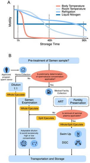 Preserving conditions and strategies of liquid storage of human sperm. (A) A general decreasing trend of sperm motility over time when stored at body temperature, room temperature, refrigeration conditions, or liquid nitrogen in vitro. (B) Schematic overview of a possible workflow when making decisions about whether the pretreatment of semen samples before liquid preservation should be conducted or not.