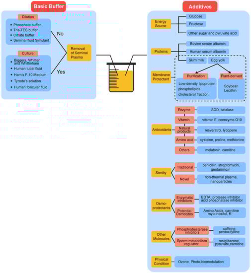 The addition of substances such as nutrients and protectants to maintain spermatozoa during the extended storage is essential, known as the extender (or culture medium). Nowadays, most extenders utilized for liquid storage of sperm are typically composed of two parts: buffers, providing a suitable physical and chemical environment for sperm, such as stable buffer capacity and osmolality pressure, similar to natural cases; and additives, such as antioxidants and membrane stabilizers, offering support to extracellular and adverse intracellular factors (Figure 4). Compared with cryopreservation, sperm stored in the liquid state are confronted with more complicated risk factors. Chief among them are negative effects of sperm metabolism, cold shock, and bacterial contamination.