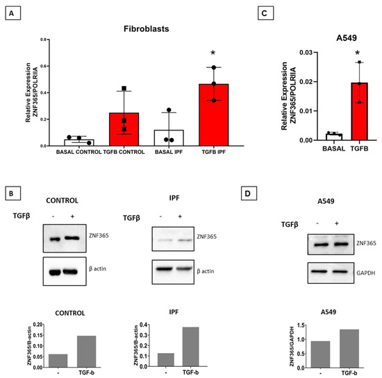 To corroborate results obtained with global gene expression [4,5], we exposed fibroblasts derived from normal human and IPF lungs to TGFβ-1. This potent profibrotic mediator plays a relevant role in lung fibrosis. As shown in Figure 3A,B, ZNF365 was significantly overexpressed at mRNA (p < 0.05 and protein levels in both normal and IPF fibroblasts after TGFβ−1 stimulation (10 ng/mL) for 24 h. Since ZNF365 was also found overexpressed in alveolar epithelium from IPF lungs, we examined its expression in the A549 epithelial cell line stimulated with TGFβ-1 by qPCR and Western blot. As shown in Figure 3C,D, ZNF365 was significantly upregulated at both mRNA (p < 0.05) and protein levels.
