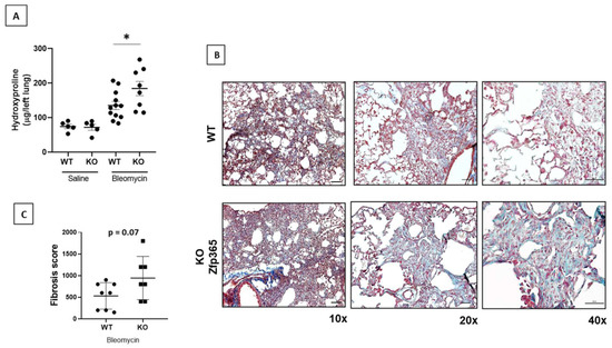 An exacerbated fibrotic response was observed in Zfp365-deficient mice. (A) Lung hydroxyproline content at 21 days after bleomycin instillation of Zfp365 KO mice (n = 8) and WT (n = 12). (B) Representative light microscopy images of Masson’s trichrome stained lung tissue sections in three different magnifications (scale bars 100 and 50 μm) from WT and Zfp365 KO mice 21 days after bleomycin instillation. (C) Fibrosis score for grading lung histopathological changes. Results are shown as mean ± SEM. Statistical significance was determined by the Student’s t-test with Welch’s correction (* p < 0.05).