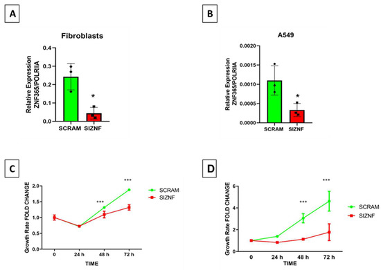 Considering that Zfp365 deficient mice developed severe lung fibrosis after bleomycin instillation, we decided to explore in vitro the functional behavior of lung fibroblasts and epithelial cells after silencing this zinc finger protein. Using specific siRNA sequences and their respective scrambled control sequences, we show with qPCR analysis that ZNF365 mRNA was significantly downregulated at 48 h in both cell types (p < 0.05) (Figure 5A,B). After silencing the gene in lung fibroblasts and in A549 epithelial cells, we performed a growth rate analysis using WST-1. A significant decrease was observed in silenced cells for ZNF365 at 48 and 72 h (p < 0.001) (Figure 5C,D).