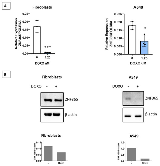 Doxorubicin provokes DNA damage by inhibiting topoisomerase II and has a senescence-promoting effect in different cell types. We found that stimulation of normal human lung fibroblasts or A549 epithelial cells for 48 h with doxorubicin (1.25 μM) significantly reduces ZNF365 expression both at the mRNA (p < 0.001, p < 0.05) and protein levels (Figure 7A,B).