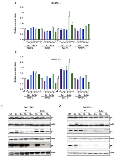 (A,B). Analysis of the expression of the FDXR2, DDB2, ZMAT3 and RPS27L genes by RT-qPCR in CAL27 (A) and SQ20B (B) cells treated for 24 h with cetuximab (Cx), cisplatin (Cis) at the IC50 and IC75 and the Cx/Cis combination. Data is represented as mean from two independent experiments +SEM. No significant differences were observed between non-treated cells and each treated condition (Kruskal-Wallis and Dunn post-test). (C,D). Western blot analysis of p53, p73 and p63 expression in whole protein extracts from CAL27 (C) and SQ20B (D) cells treated with cetuximab (Cx), cisplatin (Cis) at the IC50, IC75 and IC90, and the Cx/Cis combination for 24 h. The blots that are shown are representative examples of three independent experiments.