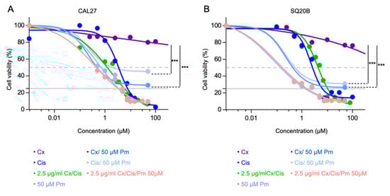A total of 1 × 104 cells were seeded per well in 96–well microplates (Falcon Multiwell, Thermofisher, Waltham, MA, USA), and different concentrations of cisplatin (Mylan: 0; 0.1; 0.5; 1; 2.5; 7.5; 15; 30; 100 μM), cetuximab (Merck; 5 mg/mL) or PRIMA MET were applied for 48 h in 100 µL of fresh medium. For co-treatments, 2.5 µg/mL of cetuximab and/or 50 µM of prima were added to the different concentrations of cisplatin. MTT assay was performed as previously described by replacing the cisplatin solution with fresh medium supplemented with 5 mg/L MTT (Sigma, Saint-Louis, MO, USA) for 1 h []. Cells were lysed in DMSO 100% (100 μL/well). Absorbance measurements were performed at 550 nm with the LB942 Tristar2 Multimode Reader (Berthold Technologies, Bad Wildbad, Germany). The calculation of the IC50, IC75, and IC90 was performed with the GraphpadPrism V5.02 software (Graphpad, Software, San Diego, CA, USA) using non-linear regression.