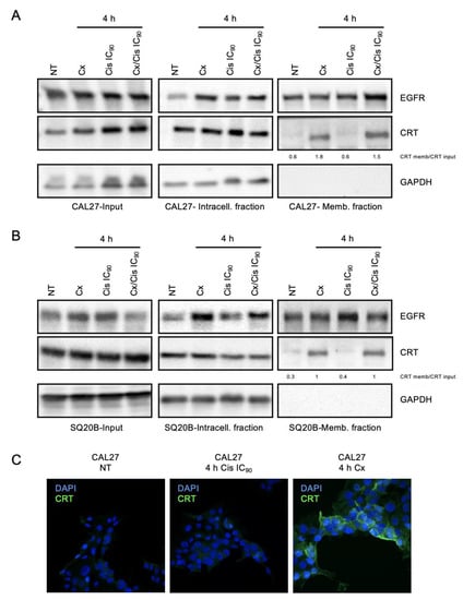 (A,B). Membrane protein purification and western blot analysis of EGFR, Calreticulin (CRT) and GAPDH expression in the input (left panels), intracellular (middle panels) and extracellular protein fractions of CAL27 (A) and SQ20B (B) cells treated with cetuximab (Cx), cisplatin (Cis) at the IC50, IC75 and IC90, and the Cx/Cis combination for 4 h. The enrichment of CRT in extracellular fractions is shown. The blots that are shown are representative examples of three independent experiments. Additional independent biological replicates are shown in supporting documents. (C). Immunocytofluorescent staining analysis of the expression of CRT in non-treated (NT) CAL27 cells (left panel), and CAL27 treated with cisplatin (Cis) at the IC90 (middle panel) or cetuximab (Cx; right panel). Nuclei are stained with DAPI. Magnification: X64.