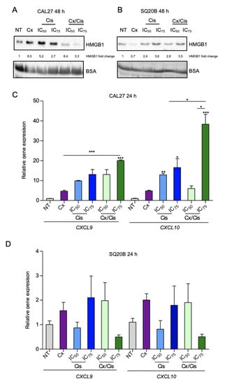 (A,B) Western blot analysis of the HMGB1 expression in the supernatant from CAL27 (A) and SQ20B (B) cell cultures harvested 48 h after with cetuximab (Cx), cisplatin (Cis) at the IC50 and IC75 and the Cx/Cis combination. Signals were quantified respectively to the actin loading control and normalized with respect to the non-treated control (quantification results are shown). The blots that are shown are representative examples of two independent experiments. Additional independent biological replicates are shown in supporting documents. (C,D). Analysis of the expression of the CXCL9 and CXCL10 by RT-qPCR in CAL27 (C) and SQ20B (D) cells treated for 24 h with cetuximab (Cx), cisplatin (Cis) at the IC50 and IC75 and the Cx/Cis combination. Data is represented as mean from two independent experiments +SEM. Kruskal-Wallis and Dunn post-test p-values: * p < 0.05; ** p < 0.01; *** p < 0.001.