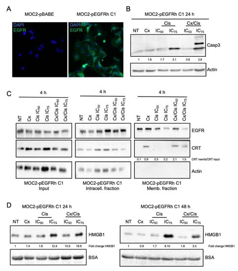 (A). Immunocytofluorescent staining analysis of the expression of EGFR in MOC2 cells that were stably transfected with the empty pBABE (left micrograph) and pBABE-hEGFR (right micrograph, MOC2-phEGFR C1 clone) expression plasmid. Nuclei are stained with DAPI. X40. (B). Western blot analysis of cleaved caspase-3 (Casp3) expression in whole protein extracts from MOC2-phEGFR C1 cells treated with cetuximab (Cx), cisplatin (Cis) at the IC50 and IC75, and the Cx/Cis combination for 24 h. Signals were quantified respectively to the actin loading control and normalized with respect to the non-treated control (quantification results are shown) (C). Membrane protein purification and western blot analysis of EGFR, Calreticulin (CRT) and Actin expression in the input (left panels), intracellular (middle panels) and extracellular protein fractions of MOC2-phEGFR C1 cells treated with cetuximab (Cx), cisplatin (Cis) at the IC50 and IC75, and the Cx/Cis combination for 4 h. The enrichment of CRT in extracellular fractions is shown. (D). Western blot analysis of the HMGB1 expression in the supernatant from MOC2-phEGFR C1 cell cultures harvested 24 h (left panels) and 48 h (right panels) after with cetuximab (Cx), cisplatin (Cis) at the IC50 and IC75 and the Cx/Cis combination. All blots shown in this figure are representative examples of three independent experiments. Additional independent biological replicates are shown in supporting documents.