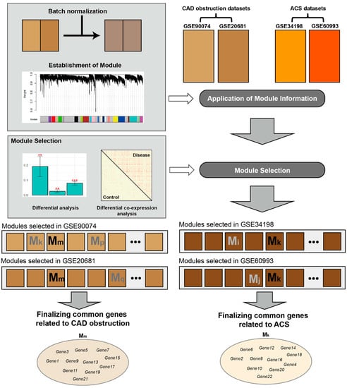 Module selection or identification of disease-related genes is typically performed using integrated datasets [,,,]. Our study analyzed two blood CVD datasets, including different comparative combinations of phenotypes, such as CAD-low and high stenosis and ACS-CN. Lee and Lee [] suggested that a significant amount of information in individual datasets may be lost if the datasets are intuitively integrated without a special strategy. Therefore, the original datasets that were not batch-removed were processed to identify disease-related modules or genes (Figure 1).