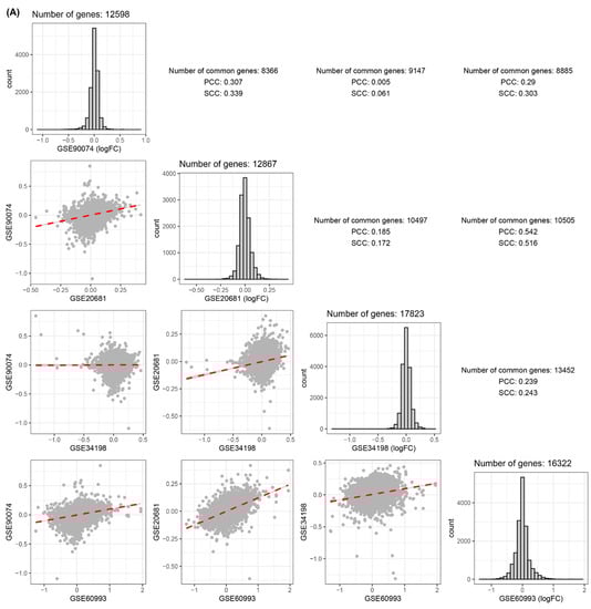 Obstructive CAD- or ACS-related signatures (i.e., FCs between the two statuses for all genes) were compared based on Pearson’s and Spearman’s correlation coefficients (PCC and SCC). A blood dataset (GSE90074) exhibited a high correlation between CAD obstruction-related signatures and those from GSE20681 (PCC:0.307, SCC:0.339, Figure 2A). The highest correlation coefficient was obtained in the comparison of disease-related signatures between GSE20681 and GSE60993 (Figure 2A). Two comparative pairs (GSE90074–GSE20681 and GSE34198–GSE60993) exhibited significantly high correlations (Figure 2A).