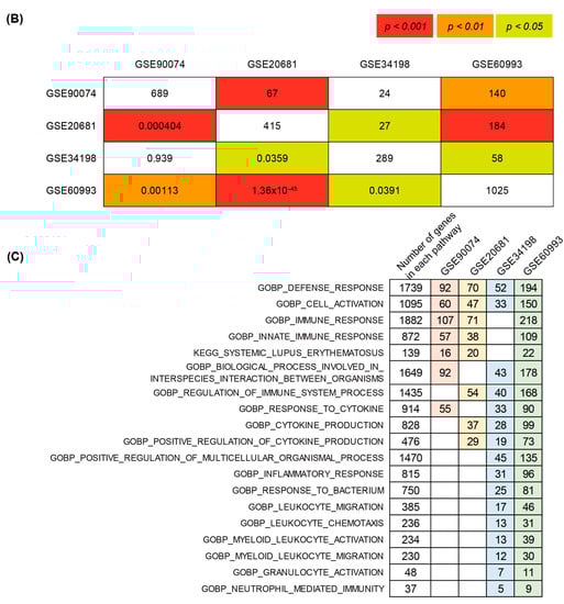 Probes or probe sets presenting minor variances were excluded. We calculated the standard deviations (SDs) of the expression levels for all genes across samples and then removed the genes with low SDs of 40% (Table S2). GSE90074, GSE20681, GSE34198, and GSE60993 datasets measured RNA expression using Agilent and Illumina platforms, respectively. Therefore, they had different transcript identifiers (IDs) for the probes or probe sets. To integrate the two blood datasets into a large dataset, all probe or probe set IDs were remapped to the Entrez IDs. For multiple probes or probe sets that were annotated with a gene-based Entrez ID, the probe with the maximum mean expression value using the “collapseRows” function in the weighted gene co-expression network analysis (WGCNA) package [] was used.
