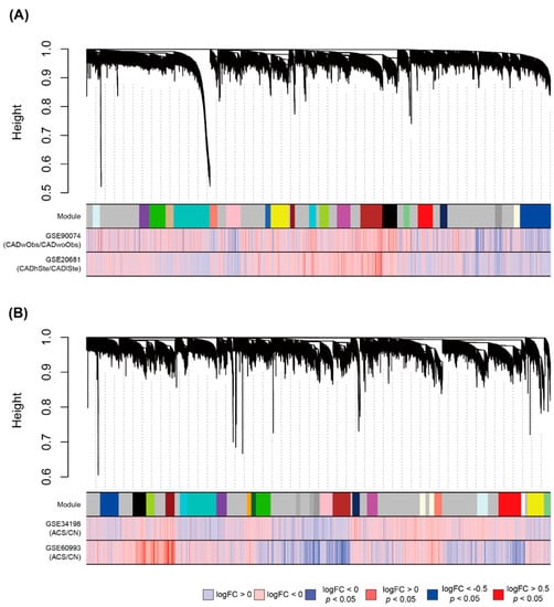 Establishment of modules via weighted gene co-expression network analysis (WGNCA). (A) Use of GSE90074 and GSE20681 for construction of CAD obstruction-related modules and (B) use of GSE34198 and GSE60993 for construction of ACS-related gene sets. Modules include genes with high correlation based on biweight midcorrelation and are depicted with different colored planes. Each plane consists of numerous lines of the same color, with a single line representing a gene. Color bars in the lower part indicate fold change (FC) values (logFC) between two conditions calculated by the limma package. Height indicates “1 − (topological overlap)”, described by the network dendrogram. Abbreviations: FC, fold change; CAD, coronary artery disease; CADwObs, CAD with obstruction; CADwoObs, CAD without obstruction; ACS, acute coronary syndrome; CN: matched control.
